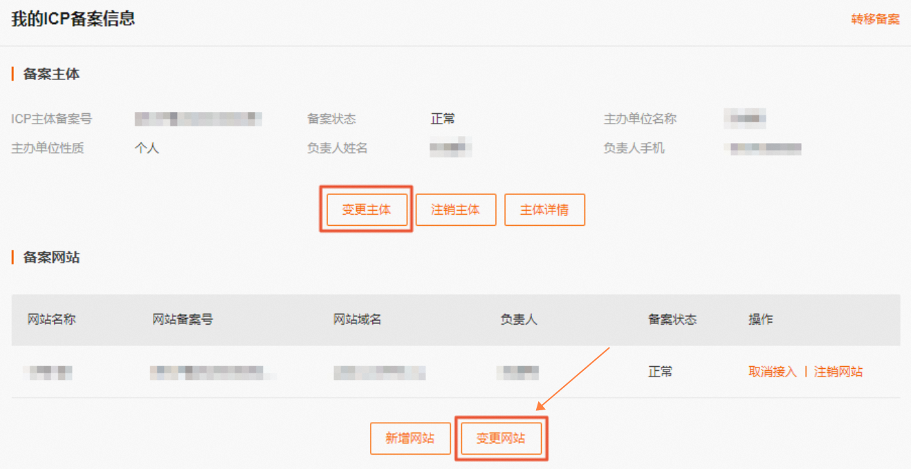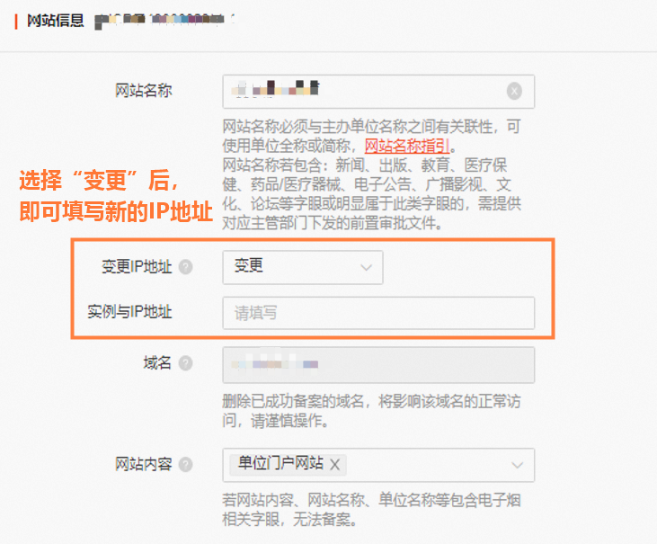 如需变更备案信息的中ip地址,可登录阿里云备案系统点击变更网站按钮,进入网站信息页面,将变更IP地址处选择为“变更”选项后,即可在实例与IP地址填写需要更换的IP地址。