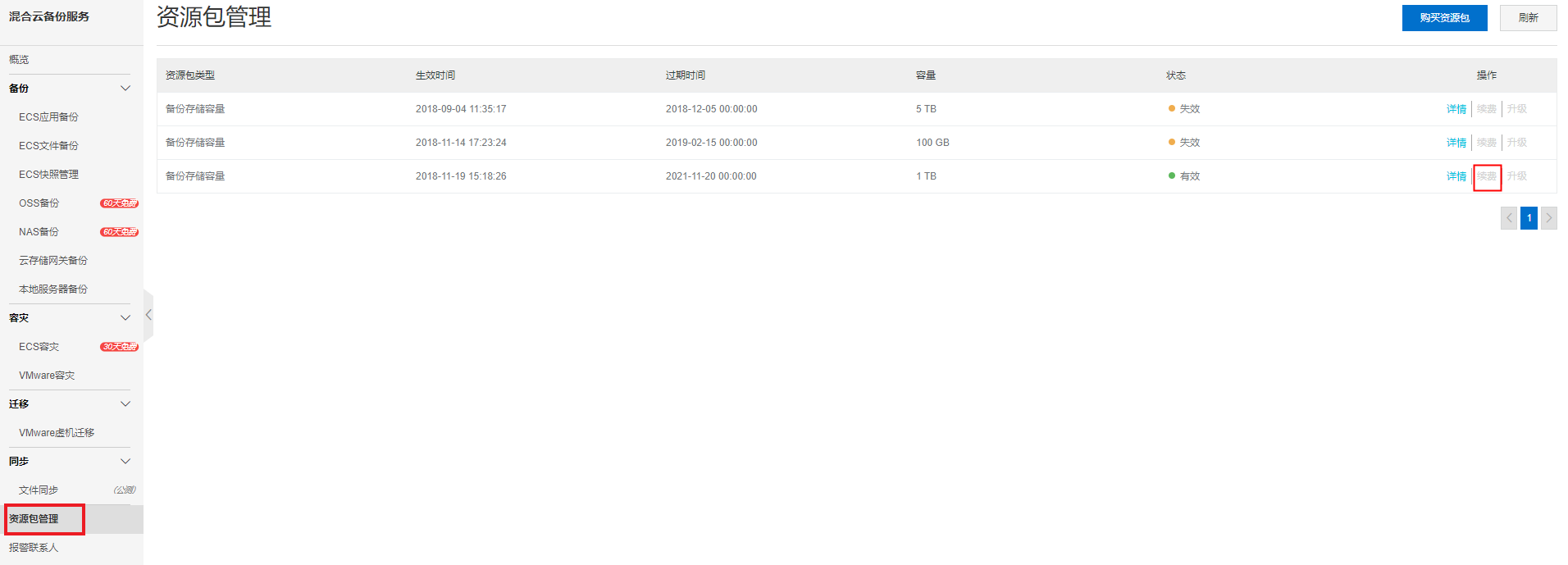 登录 混合云备份服务控制台 。点击左侧的 资源包管理。找到需要续费的资源包,点击右侧操作下的续费。