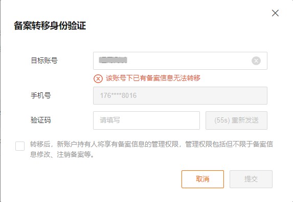 在进行备案信息账号间转移时提示“该账号下已有备案信息无法转移”(如图),是因为目标账号下已存在成功的备案信息或有备案订单正在填写中/审核中,请核实目标账号信息,如存在备案进行中订单,且无继续提交备案的需求,可先放弃备案订单后操作再转移。