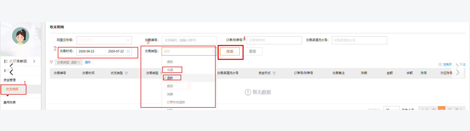 登录收支明细里选择交易时间>交易类型,点击搜索来查询退款/充值记录。