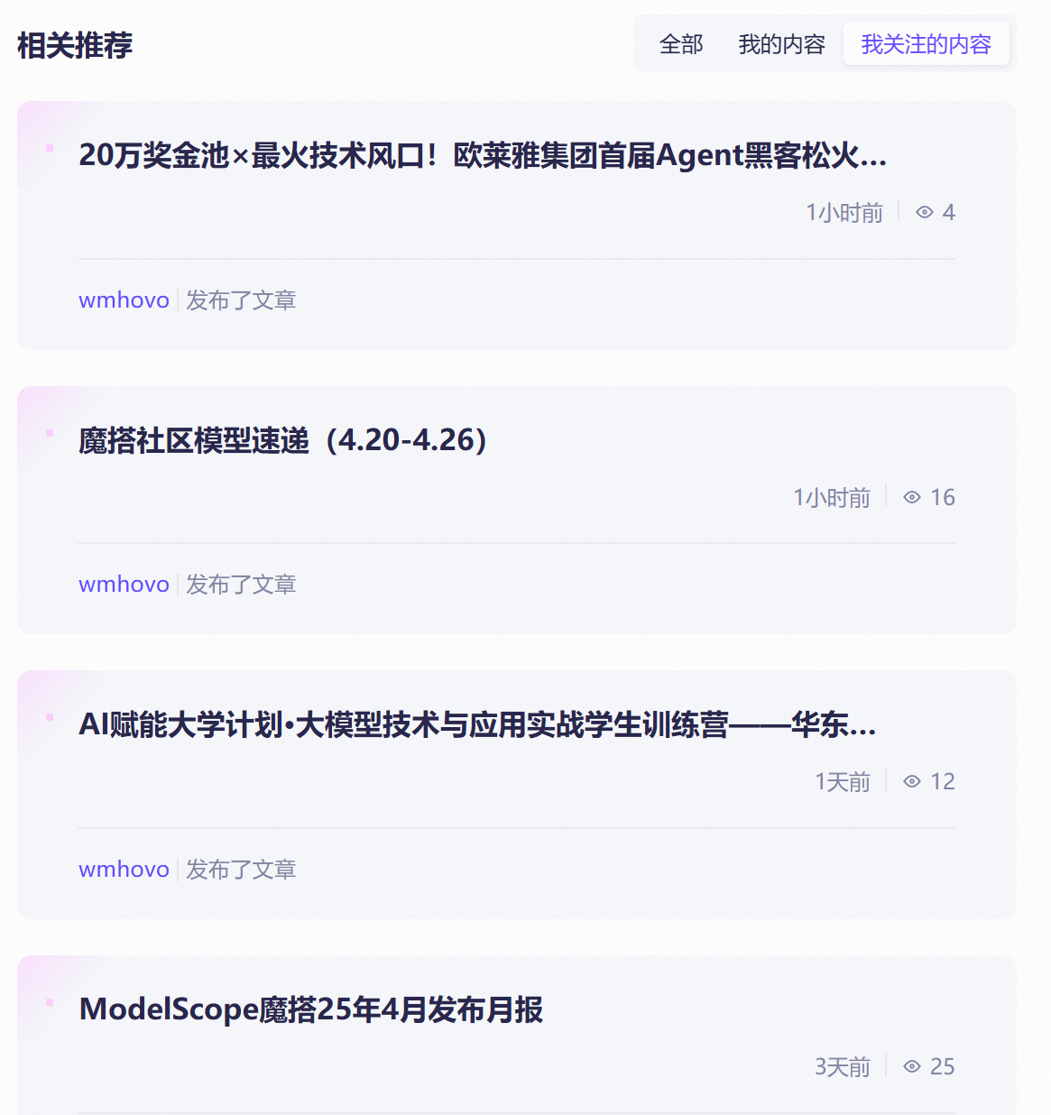我关注了通义实验室,方便以后有什么新模型我能及时看到。但我根本找不到我都关注了谁,关注的人发布了什么,只能在组织主页去看。