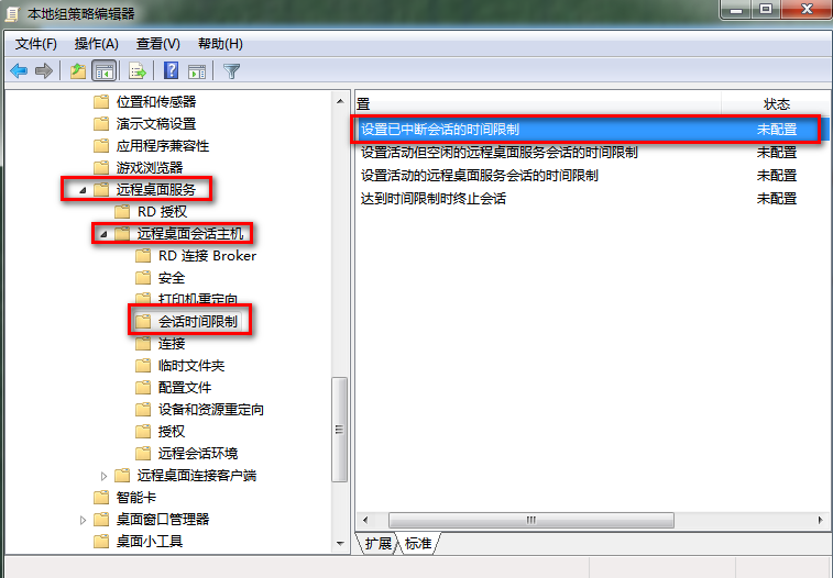 3、在Windows组件中,选择【远程桌面服务】->【远程桌面会话主机】->【会话时间限制】。然后在右侧,点击设置已中断会话的时间限制。
