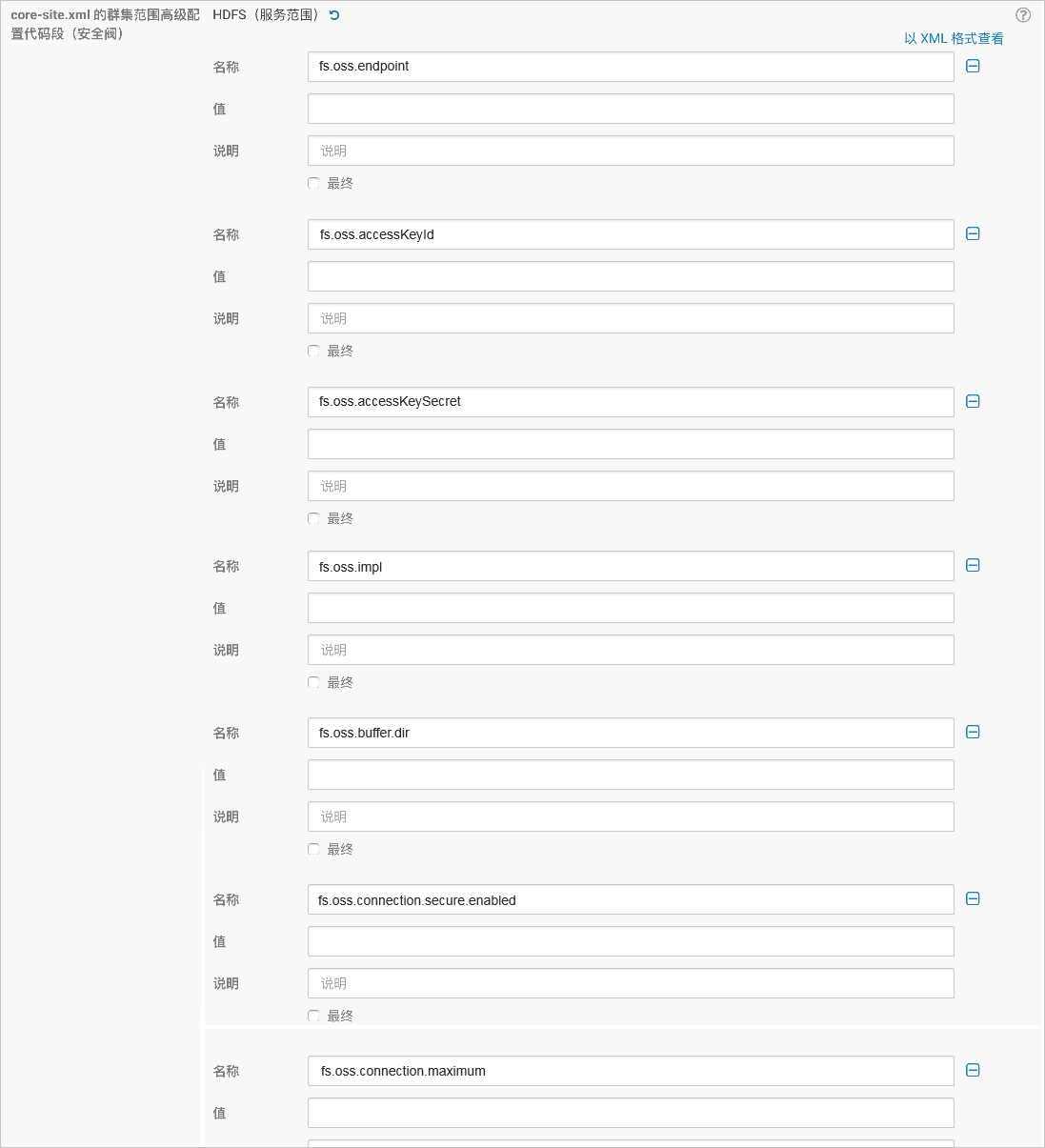 | fs.oss.impl | Hadoop OSS 文件系统实现类。目前固定为:org.apache.hadoop.fs.aliyun.oss.AliyunOSSFileSystem |