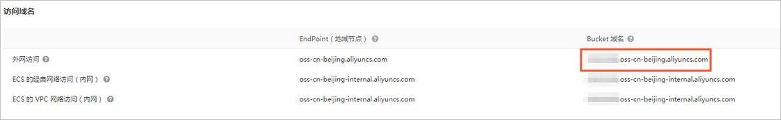 - 在访问域名区域查看Bucket域名。