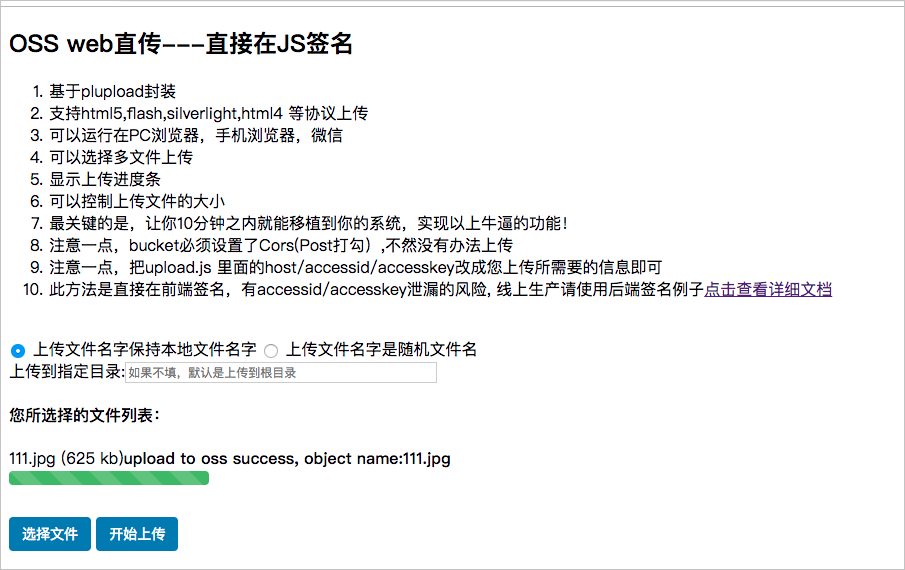 步骤3:使用Web端直传实践方案Demo进行上传测试