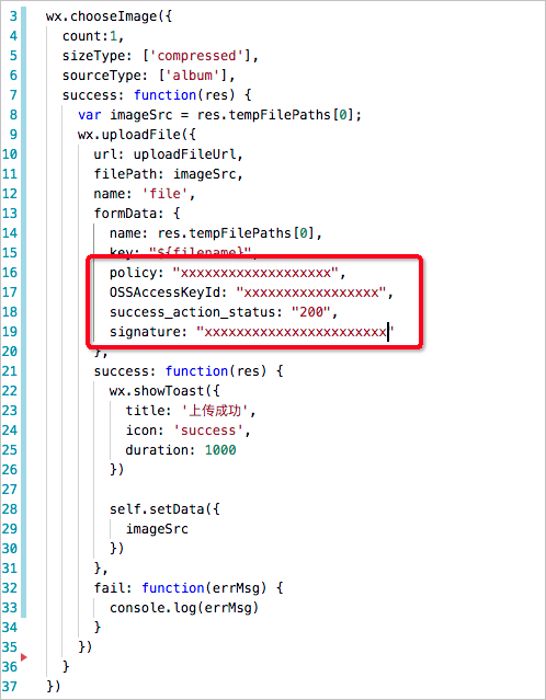 说明 小程序上传主要是计算signature和policy,具体实践中建议用户在服务端进行相关签名的计算后返回给小程序,现提供