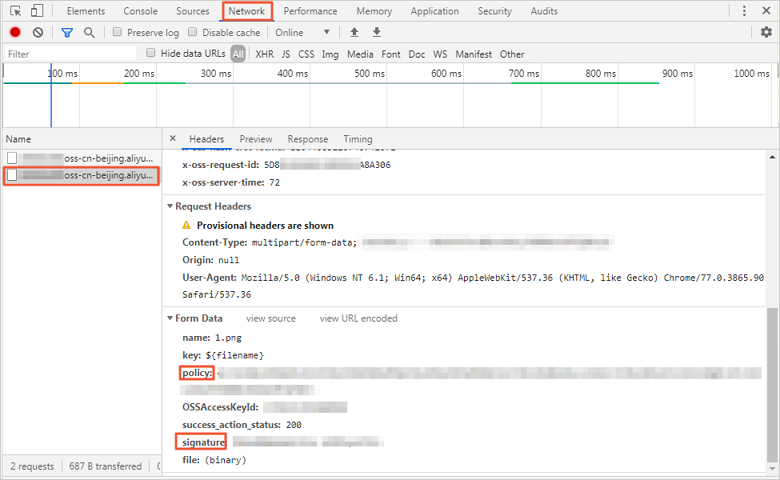 按F12开启web调试,在请求中的Form Data中获取signature和policy。