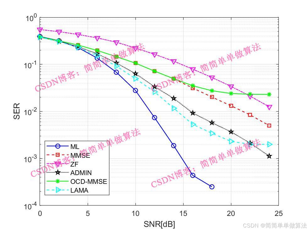 基于ADMM无穷范数检测算法的MIMO通信系统信号检测MATLAB仿真,对比ML,MMSE,ZF以及LAMA
