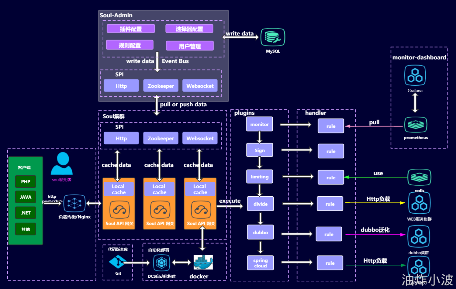 Soul 是基于 WebFlux 构建的响应式 API 网关,支持 Dubbo、Spring Cloud 等多种协议,具备高性能、异步、跨语言特性。提供插件化架构,支持热插拔、动态配置、A/B 测试与蓝绿发布,集成鉴权、限流、熔断等丰富插件,适用于微服务网关场景。